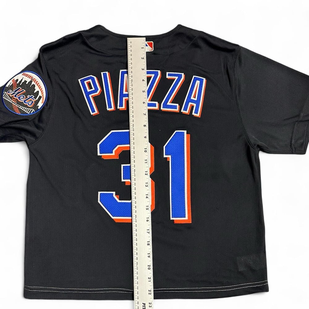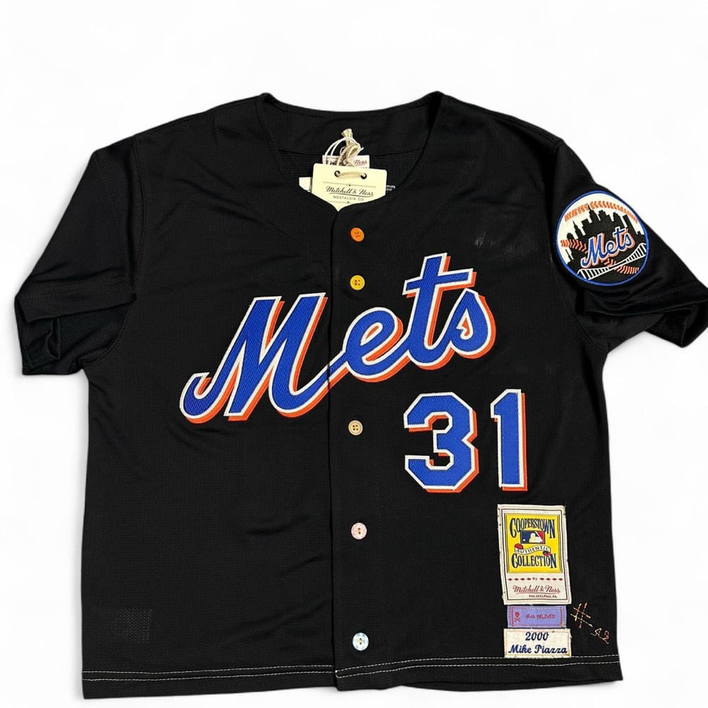 Mitchell & Ness Mike Piazza New York Mets black jersey. IRIS BELOVED REWORKED. Changed buttons. Cropped, see pictures for measurements. 1 OF 1.Mitchell & Ness Mike Piazza New York Mets black jersey. IRIS BELOVED REWORKED. Changed buttons. Cropped, see pictures for measurements. 1 OF 1.